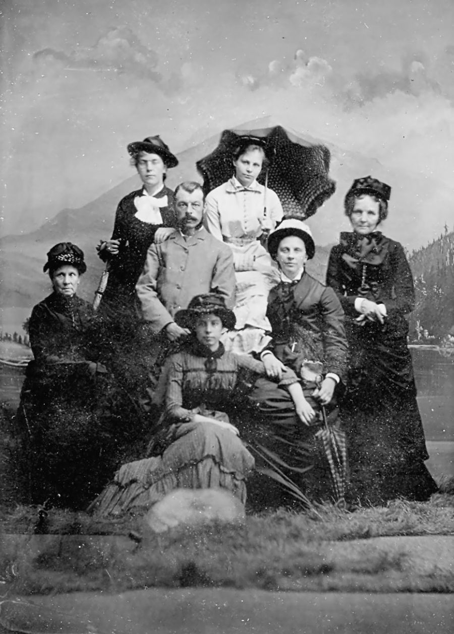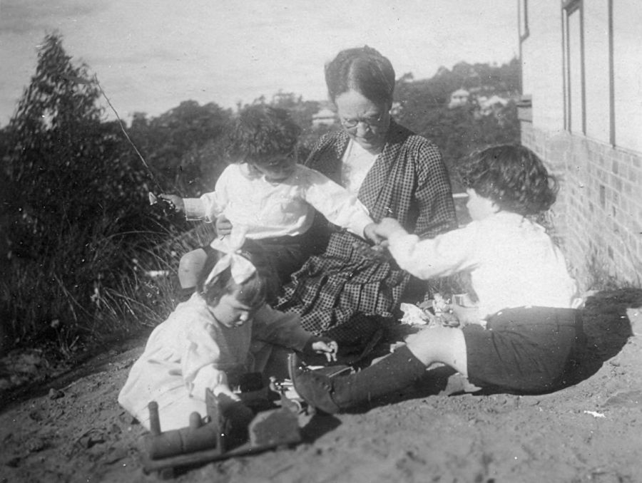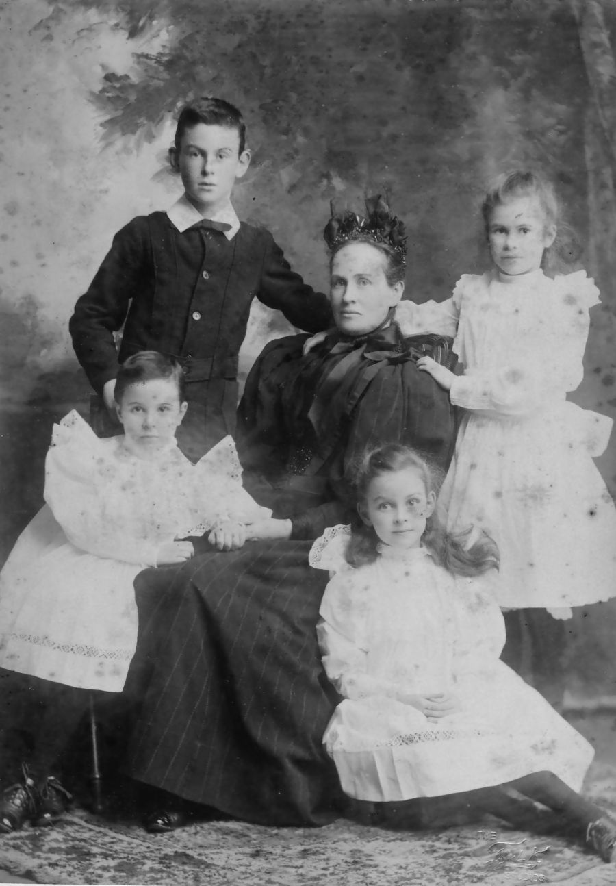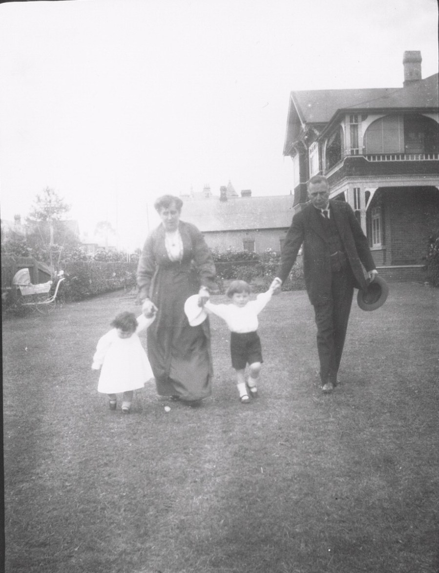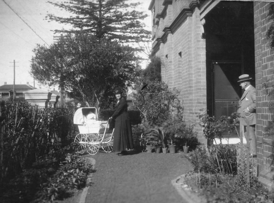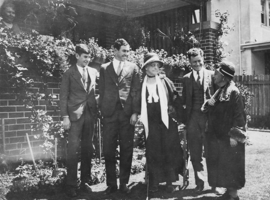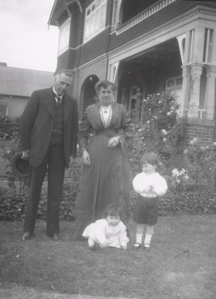 Back Row: Mr. Moore, Miss Vera Whiting (bridesmaid), Captain and Mrs. Waters, Mr. Whiting, senr., Archdeacon Abbott, Mrs. Bennett, Dr. H. Kendal, Mr. Watson, Mr. Keith Whiting and Mr. Cedric Whiting. Front Row: Miss D. Whiting and Miss Waugh (bridesmaids), Mrs. Whiting, the Bride and Bridegroom, Mrs. Waugh, Miss Teece (bridesmaid). Dr. Waugh, and Miss Freda Lamb (bridesmaid). Reproduction by Howard Harris
